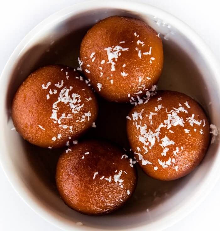 Home-made sweet milk dumplings soaked in rose flavoured sugar syrup (four pieces).