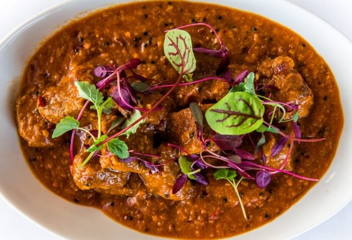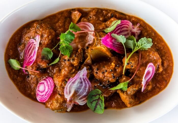 Gluten free. Traditionally served on special occasions, succulent goat meat cooked on the bone with tomato, cloves, cardamom pods and fennel.