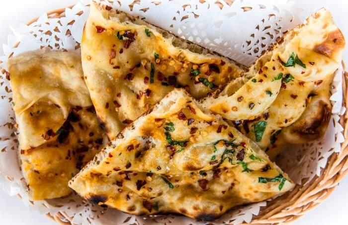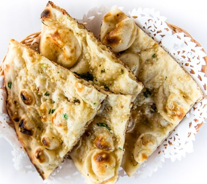 Punjabi leavened bread enriched with yoghurt, topped with garlic and ghee.