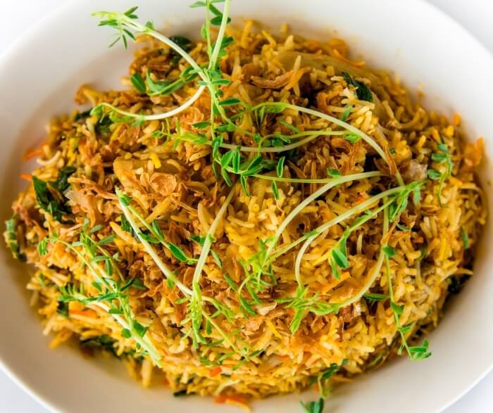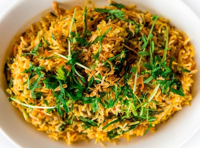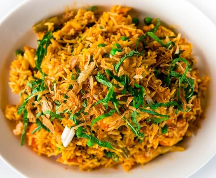 Seasoned vegetables cooked with basmati rice and spices.