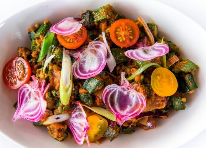 Vegan. Gluten free. Okra cooked with sauted tomatoes and onion. A traditional Punjabi home cooked dish.