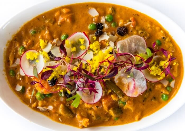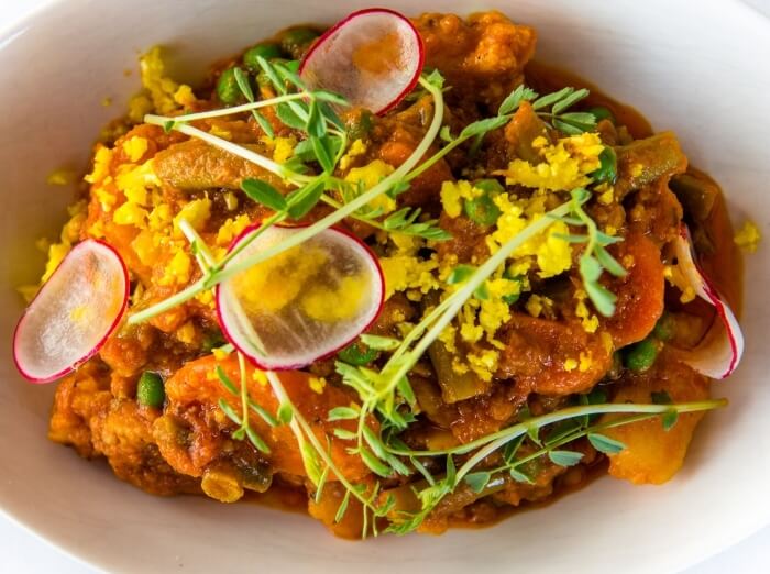 Vegan. Gluten free. Combination of seasonal vegetables cooked in a thick sauce.