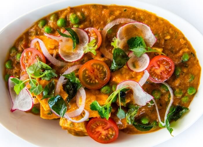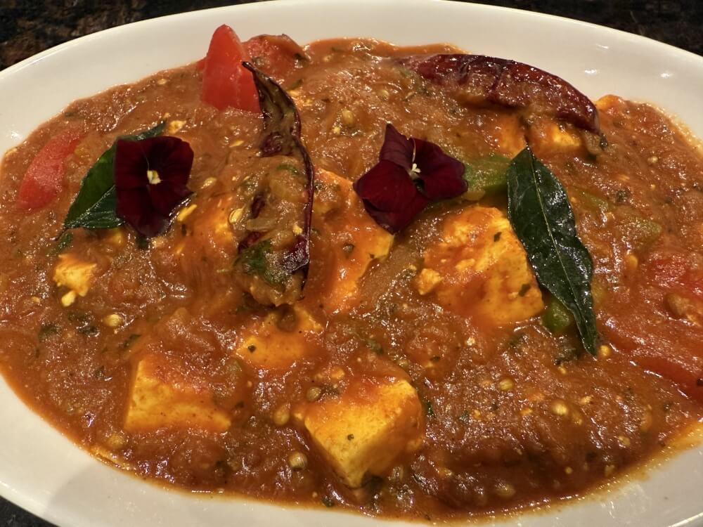 Gluten free. Fresh ricotta cheese stir-fried in a rich tomato curry with crushed spices, green capsicum and onions.