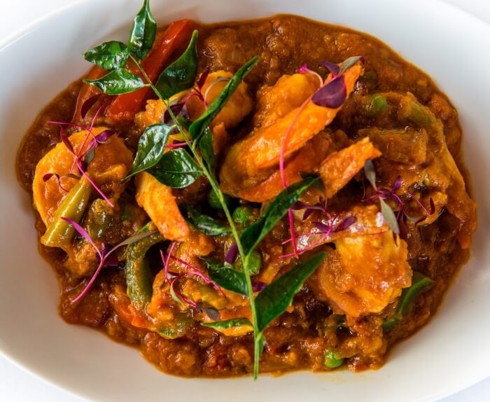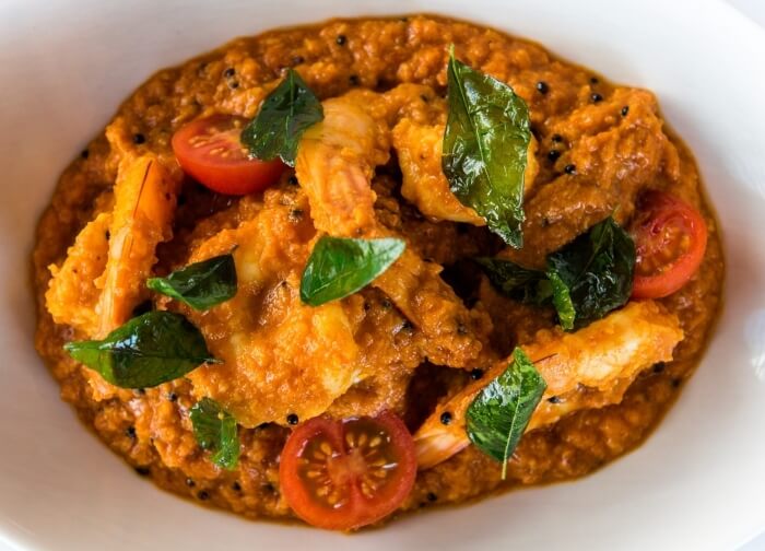 Gluten free. Australian Tiger Prawns cooked in a sour medium hot sauce with a delicate blend of authentic spices including dried coconut and mustard seeds.