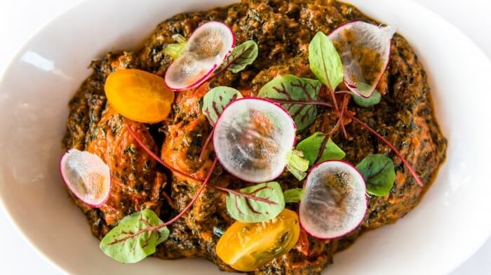 Chef's Special. Free range chicken marinated, grilled in charcoal tandoor, then simmered in a sauce, cooked with chopped spinach and fenugreek leaves.