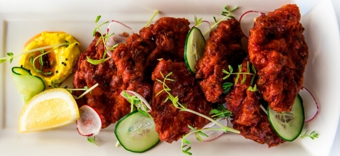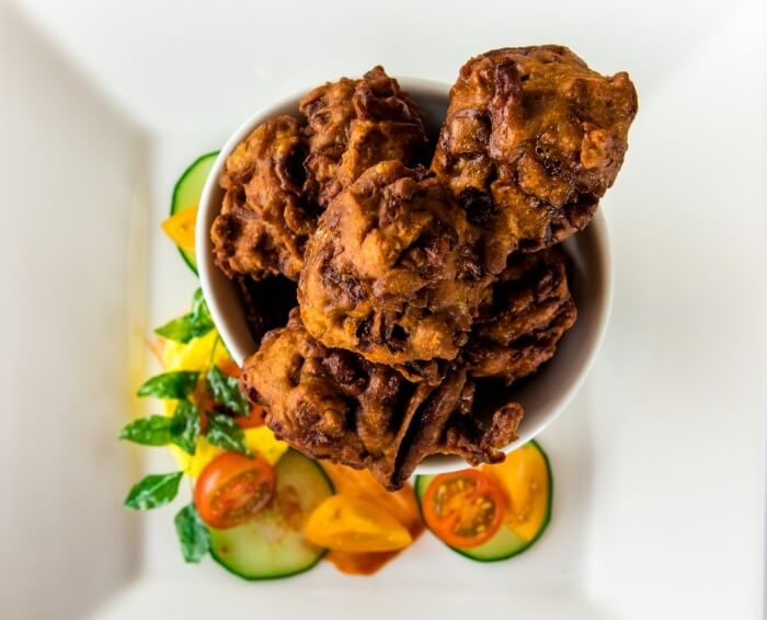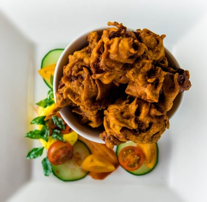 Four pieces. Made from chickpeas, flavoured with spices and deep fried. Served with a tamarind and tomato chutney.