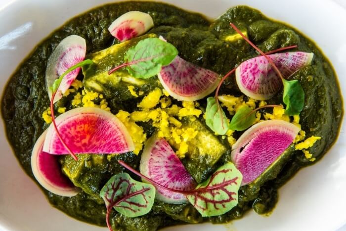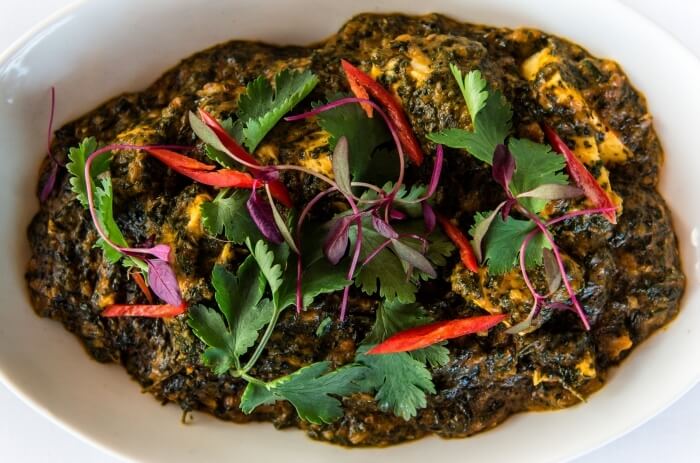 Chef's Special. Paneer simmered in a sauce, cooked with chopped spinach and fenugreek leaves.