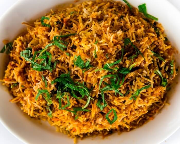 Succulent goat cooked with basmati rice and spices.