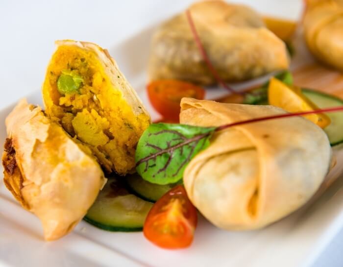 Four homemade triangles of mildly spiced mashed potato and seasonal vegetables wrapped in a light pastry.