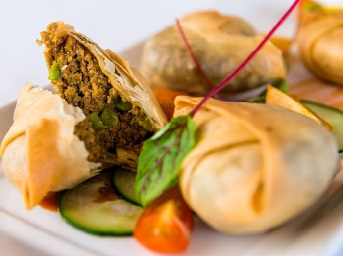 Four homemade triangles of mildly spiced lamb mince and peas wrapped in a light pastry.
