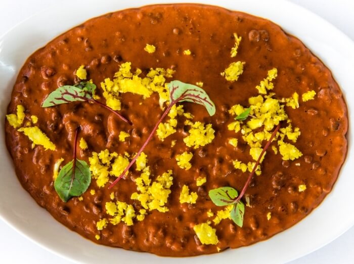 Gluten free. Black lentils cooked with tomato, ginger, garlic, coriander and our special blend of spices. Finished with a touch of cream.