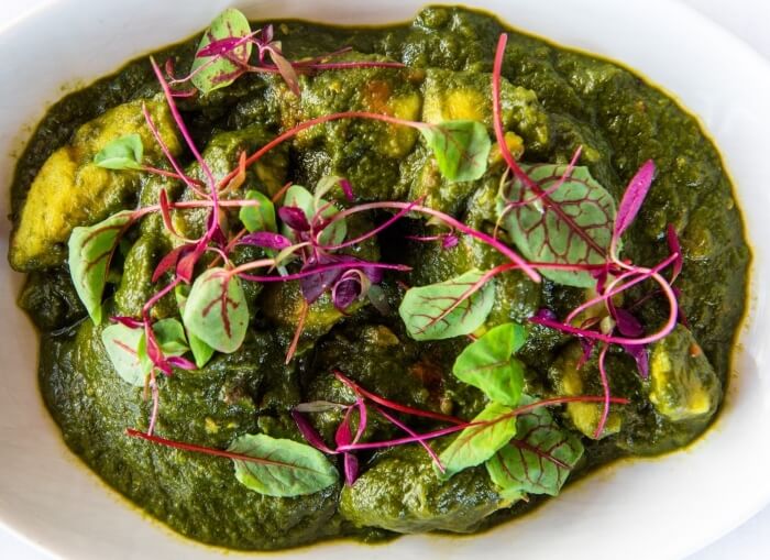 Gluten free. Pieces of fresh ricotta cooked in a curry made of finely chopped spinach and spices such as cumin and cardamom.