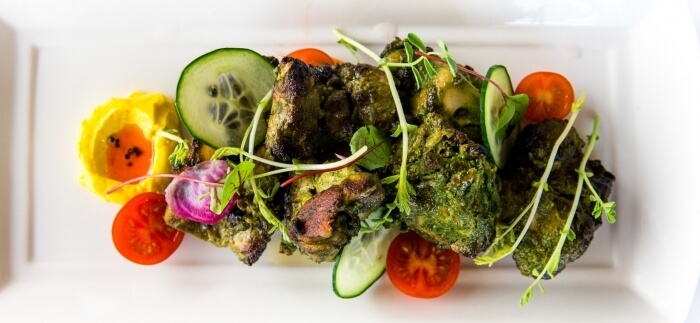 Gluten free. Six piece of free range chicken marinated in spinach, coriander and green chilli, then grilled in our charcoal tandoor.
