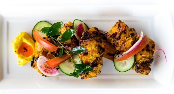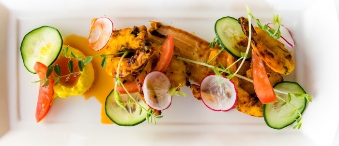 Gluten free. Six Australian Tiger prawns marinated in spiced yoghurt, skewered then cooked to perfection in our charcoal tandoor.
